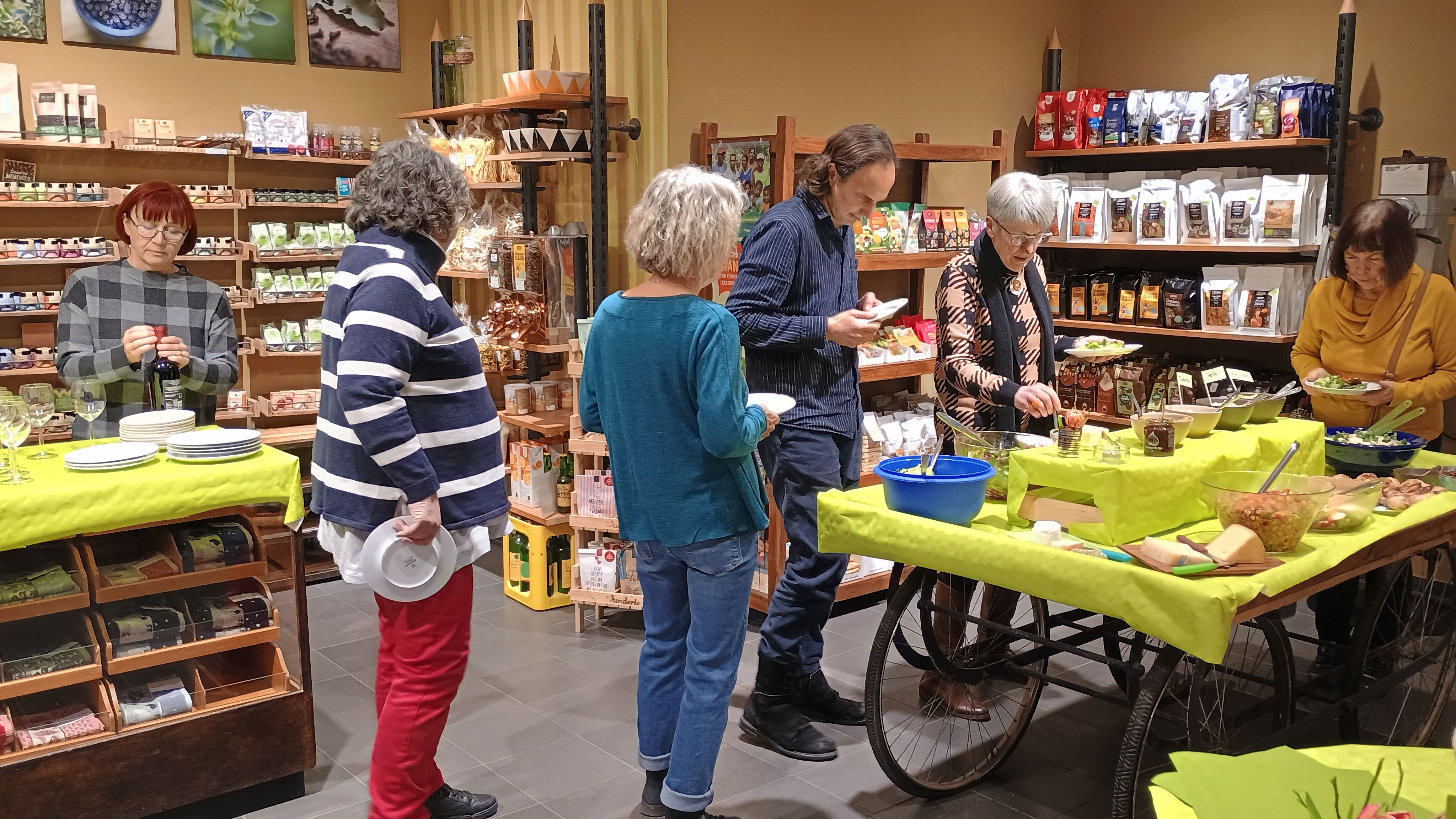 Nach dem Begrüßungssekt mit Dankesworten von Sibylle Enderle war das Buffet eröffnet, das im Nebenraum mit köstlichen Salaten, Aufstrichen und vielerlei Leckereien, die zum großen Teil aus und mit den Weltladen-Produkten vom Vorstand und den Hauptamtlichen angerichtet war – eine frohe Stimmung mit munteren Gesprächen, Austausch untereinander begleiteten dieses Essen.