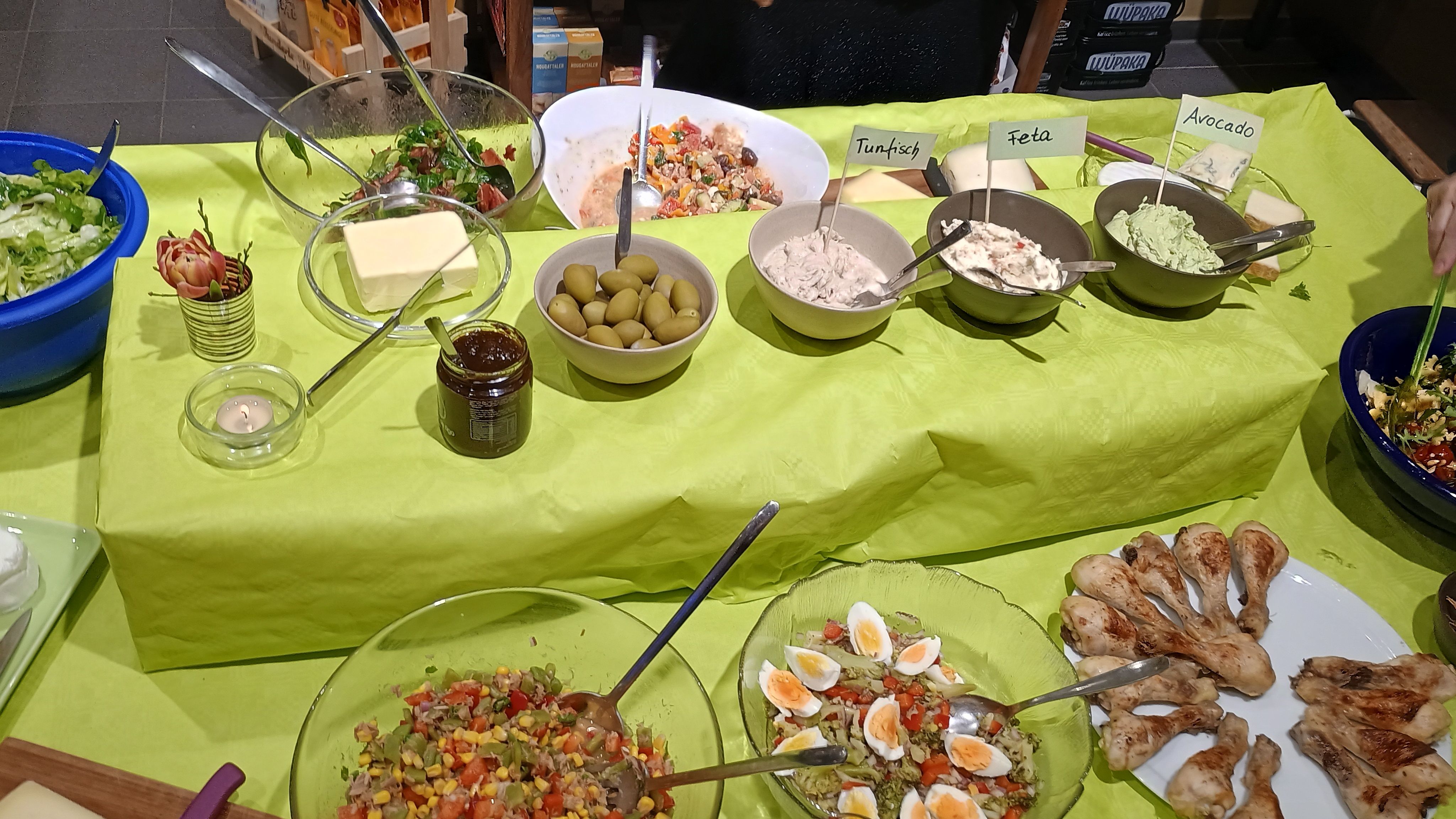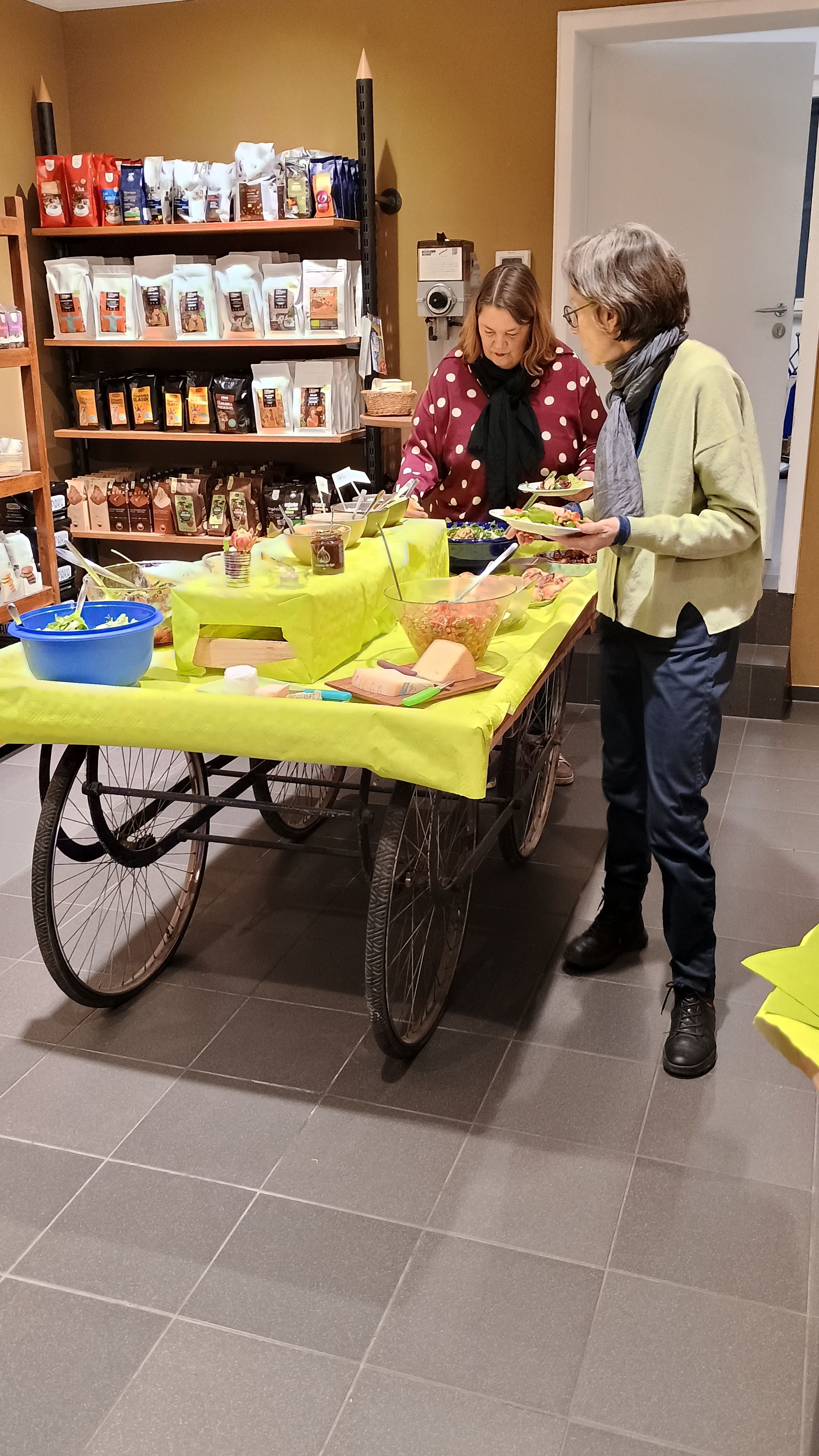 Tische wurden geschoben und mit gelben Decken, Blumen und Kerzen gedeckt, Gläser wurden auf den Verkaufstresen gestellt und nach und nach füllte sich der „Verkaufsstand“,der sonst die POIS-Waren darbot, mit gefüllten Schüsseln mit Salat, Brot und Aufstrichen – zur Dankes-Jahresfeier für die Ehrenamtlichen MitarbeiterInnen war eingeladen und Viele trudelten pünktlich ein.